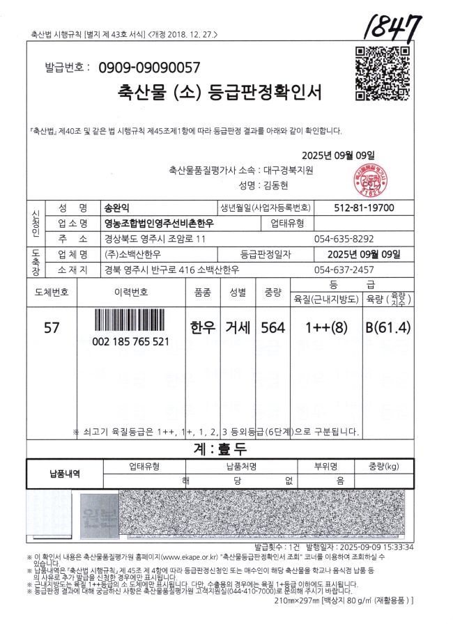 9/9 등급판정확인서 1++
